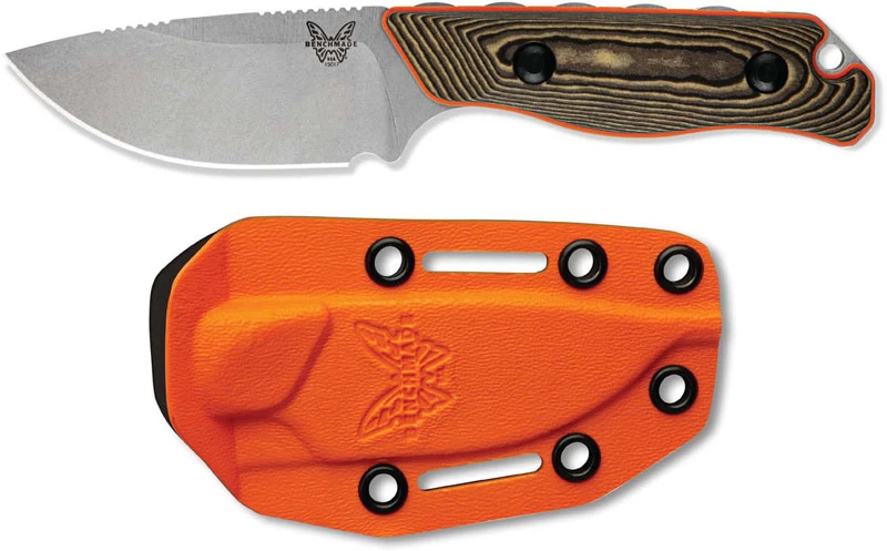 The 15017-1 Benchmade Hidden Canyon Hunter Knife is a compact hunter’s essential that features a 2.79 inch drop point fixed blade made of premium CPM S90V stainless steel, .12 inches thick, with a Rockwell hardness of 59-61, notched thumb rest and spine for secure grip and precise control, and a satin finish. The Hidden Canyon Hunter has full tang construction for strength, large spine notches and ergonomic Richlite handle scales (over a layer of orange G10) for secure purchase, and a lanyard hole. An orange Boltaron sheath is included. The Hidden Canyon Hunter Knife has an overall length of 6.42 inches, and it weighs 3.11 ounces, 4.10 ounces with the sheath. Proudly made in the USA.