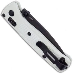A Mini Bugout?? Yes! The 533BK-1 Benchmade Mini Bugout is a scaled down version of the fiendishly popular Bugout EDC that features a 2.82 inch drop point blade made of CPM S30V stainless steel, .09 inch thick, with a Rockwell hardness of 58-60. The blade has a non reflective black finish, a top swedge to lessen weight and dual thumb studs for ambidextrous one hand opening. The slim white Grivory handle, 3.70 inches closed, has checkered texturing for secure grip, sturdy AXIS Lock, a lanyard hole and a side to side reversible deep carry mini clip mounted at the butt end. The Benchmade Mini Bugout has an overall open length of 6.49 inches, and it weighs 1.5 ounces. Proudly made in the USA.