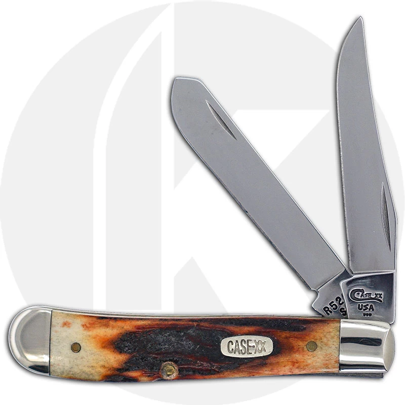 The 01714 Case Red Stag (R5207SS) Mini Trapper Knife features clip and spey blades made of mirror polished Tru-Sharp Surgical steel with nail nicks for opening. The genuine Red Stag handle, 3 1/2 inches closed, has the Case XX Shield and nickel silver bolsters. The Case Mini Trapper Knife weighs 2.7 ounces. Discontinued item, BNIB; made in the USA.