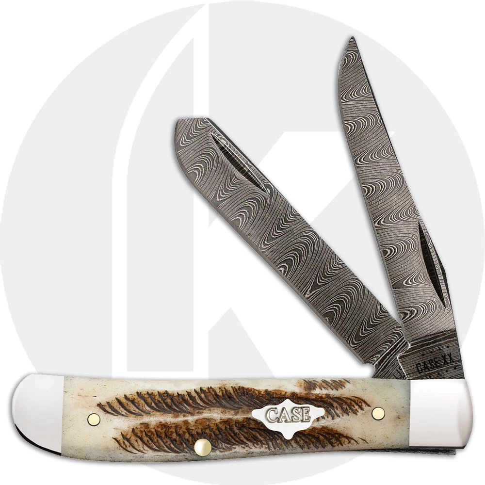 The 77466 Case Vintage Bone (V6207DAM) Mini Trapper Knife features clip and spey blades made of Ladder Damascus Carbon Steel with nail nicks for opening. The genuine Vintage Bone handle, 3 1/2 inches closed, has the Case Coat of Arms Shield and nickel silver bolsters. The Case Mini Trapper Knife weighs 2.7 ounces. Made in the USA.
