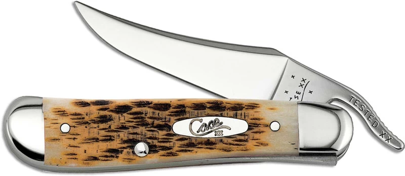 The illustrated Case Knife is the Amber Bone (61953LSS) Case RussLock Knife that features a clip blade made of Tru-Sharp surgical stainless steel, with a jimped lever for one hand opening. The Peachseed Jigged Amber Bone handle of this Case knife, 4 1/4″ closed, has a nickel silver Case shield, nickel silver bolsters and a liner lock. The Case RussLock Knife with Amber Bone handle weighs 2.7 ounces. Made in the USA.
