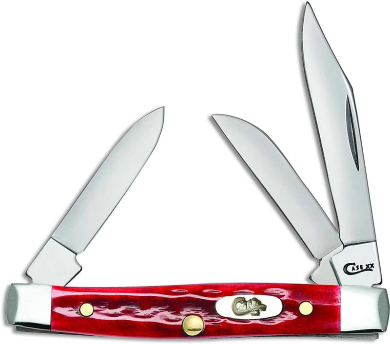 The 10305 Case Pocket Worn Old Red (6333SS) Small Stockman Knife features clip, sheepfoot and pen blades made of Tru-Sharp Surgical steel with nail nicks for opening. The Corn Cob Jig Old Red Bone handle of this Case knife, 2 5/8 inches closed, has the Case Oval Script shield and nickel silver bolsters. The Case Small Stockman Knife weighs .9 ounce. Made in the USA.