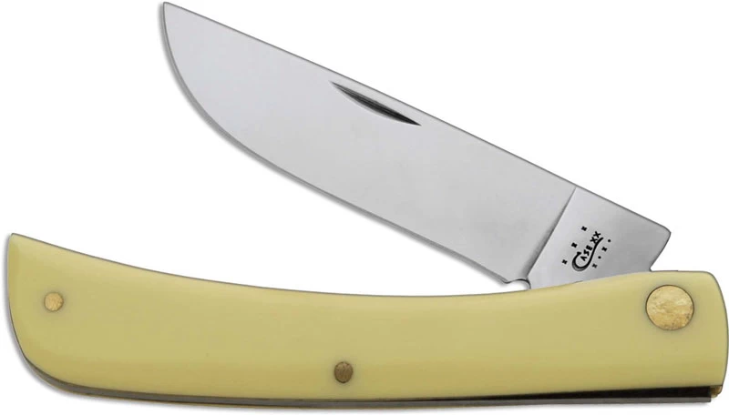 The illustrated Case Knife is the Yellow CV (3138CV) Case Sod Buster Knife that features a sod buster skinner blade made of Chrome Vanadium carbon steel with a nail nick for opening. The handle of this Case knife, 4 5/8″ closed, has brass liners and Smooth Yellow Synthetic scales. The Case Sod Buster Knife with carbon steel blade and Yellow Synthetic handle weighs 3.4 ounces. Made in the USA.