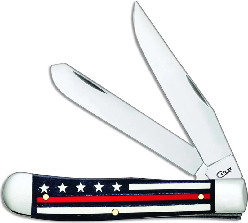 The Case Stripes of Service Series of knives is a tribute to first responders everywhere. The 07310 Case Stars of Service (6254SS) Trapper Knife features clip and spey blades made of Tru-Sharp Surgical steel with nail nicks for opening. The Smooth Natural Bone handle of this Case knife, 4 1/8 inches closed, has Black, White and Red Line color wash embellishment and nickel silver bolsters. The Case Trapper Knife weighs 4.0 ounces. Made in the USA.