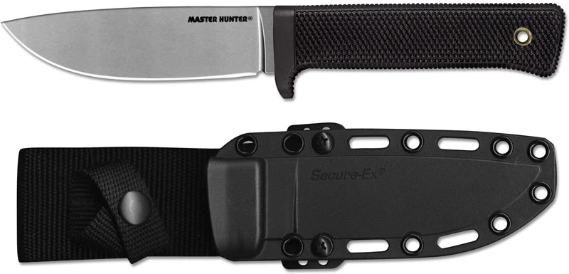 From the Cold Steel website: …The Master Hunters curved cutting edge slices effortlessly through even the toughest hide, while its stout but sharp drop point makes field dressing and skinning a breeze. The spine of the blade is a full 3/16″ thick to allow for the necessary strength and stiffness to field dress and skin even the biggest animals. The grip is specially designed to promote long use without fatigue. Made of the shock absorbent Kray-Exâ„¢, and featuring our deeply checkered surface, it won’t slip no matter how cold, wet or bloody your hands get, and it will give you a positive and secure purchase on your blade even when wearing thick gloves. Plus, Kray-Exâ„¢ has specially enduring advantages for a hunter, in that it will never rot, shrink, crack, splinter, or mildew, and is completely impervious to even the harshest weather. For safety, the Master Hunter® comes in a adaptable and versatile Secure-Exâ„¢ sheath that will accommodate just about any belt, pack or rig. the perfect companion for a dedicated hunter who deserves the very best – The Master Hunter by Cold Steel.