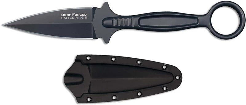 The 36MF Cold Steel Drop Forged Battle Ring II is a down to basics self defense knife made of a single piece of drop forged (not cast!) wear resistant 52100 tool steel with a non reflective dark gray finish. The Drop Forged Battle Ring II has a 3 1/2 inch double edge spear point blade that is a beefy 6.5mm thick; an ergonomic handle with integral guard and trough for secure purchase, and a ring pommel for a variety of grip options. A Secure-Ex sheath with Ulti-Clip is included. The Drop Forged Battle Ring II Knife has an overall length of 9 inches, and it weighs 7.5 ounces.