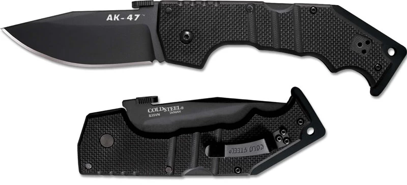 The Cold Steel AK-47 with S35VN blade steel! The 58M Cold Steel AK-47 Knife, designed by Andrew Demko, features a 3 1/2 inch clip point blade made of S35VN stainless steel, 3.5mm thick, with a non reflective black DLC coat, and patented thumb plate for ambidextrous one hand opening, as well as open on withdrawal (by snagging on the pocket edge). The grooved black G10 handle, 5 1/2 inches closed, has the sturdy Tri-Ad Lock, an extended pommel with integral lanyard hole, and an ambidextrous pocket clip mounted at the butt end. The Cold Steel AK-47 Knife has an overall open length of 9 inches, and it weighs 5.3 ounces. Made in Taiwan.