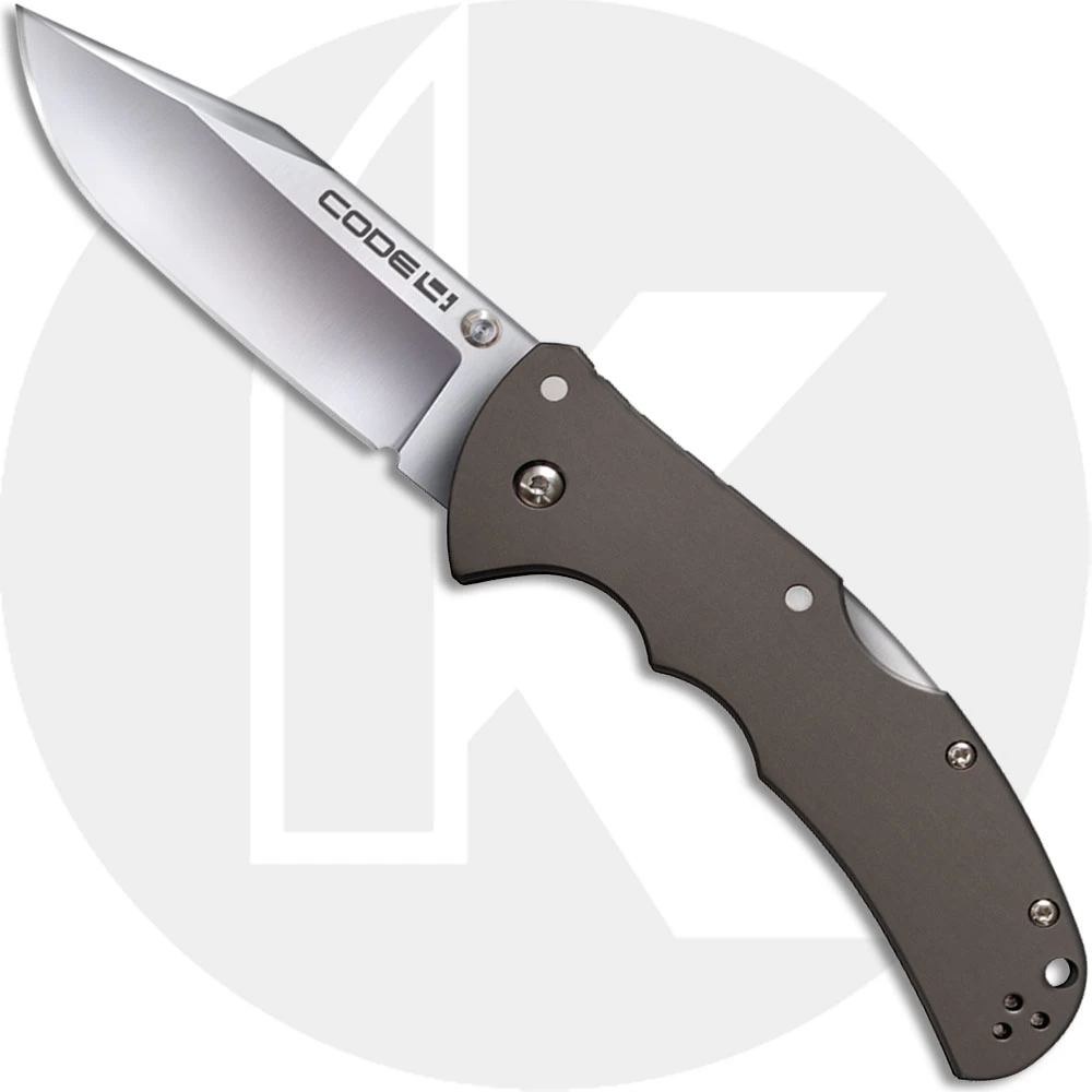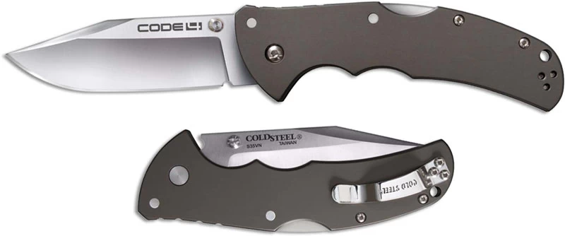 The Cold Steel Code 4 with S35VN blade steel! The 58PC Code 4 Knife features a 3 1/2 inch clip point blade made of S35VN stainless steel, 3.5mm thick, with a satin finish, and dual thumb studs for ambidextrous one hand opening. The slim profile gray 6061 aluminum handle, 5 inches closed, has finger grooves and a notched thumb rest for secure grip, sturdy Tri-Ad Lock, a lanyard hole, and ambidextrous pocket clip mounted at the butt end. The Code 4 Knife has an overall open length of 8 1/2 inches, and it weighs 4.3 ounces. Made in Taiwan.