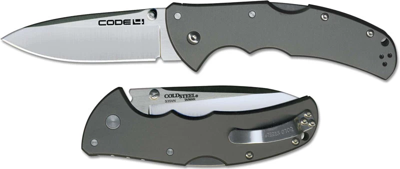 The Cold Steel Code 4 with S35VN blade steel! The 58PS Code 4 Knife features a 3 1/2 inch spear point blade made of S35VN stainless steel, 3.5mm thick, with a satin finish, and dual thumb studs for ambidextrous one hand opening. The slim profile gray 6061 aluminum handle, 5 inches closed, has finger grooves and a notched thumb rest for secure grip, sturdy Tri-Ad Lock, a lanyard hole, and ambidextrous pocket clip mounted at the butt end. The Code 4 Knife has an overall open length of 8 1/2 inches, and it weighs 4.3 ounces. Made in Taiwan.