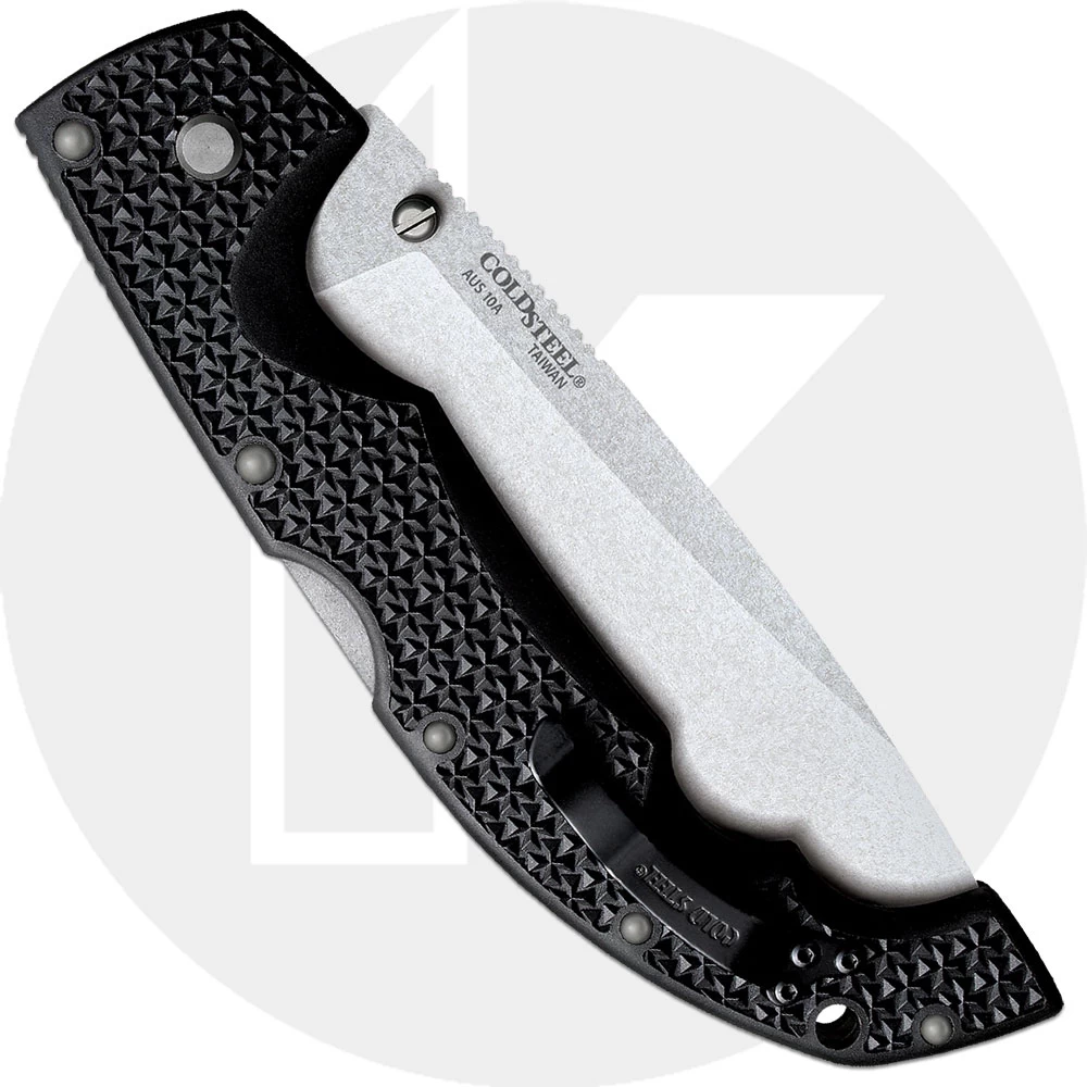The Voyager – now in a Drop Point! The 29AXB Cold Steel Extra Large Voyager Knife features a 5 1/2 inch drop point blade made of AUS 10A stainless steel, 4mm thick, with a stonewash finish, notched thumb rest for precise control, and dual thumb studs for ambidextrous one hand opening. The black Griv-Ex handle, 6 3/4 inches closed, has texturing and ergonomic contours for comfort and secure grip, sturdy lockback, lanyard hole, and an ambidextrous steel pocket clip mounted at the butt end. The Extra Large Voyager has an overall open length of 12 1/4 inches, and it weighs 8.0 ounces. Made in Taiwan.