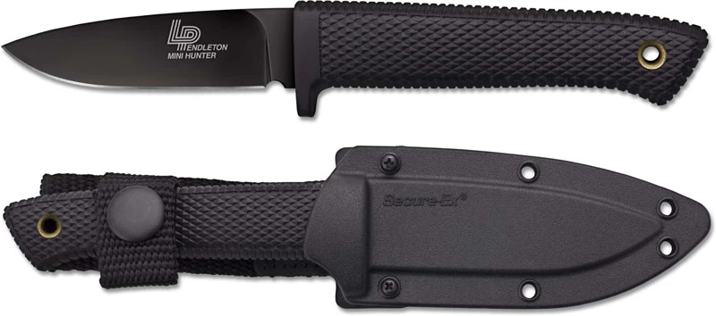 The illustrated Cold Steel Knife is the Cold Steel Pendleton Mini Hunter Knife that features a 3″ drop point fixed blade made of CPM 3-V high carbon steel, 3mm thick, with a non reflective black DLC finish. The black Kray-Ex handle of this Cold Steel Knife has texturing for secure grip, an integral guard and a lined lanyard hole. A Secure-Ex sheath is included with this Cold Steel Knife. The Cold Steel Pendleton Mini Hunter Knife with 3V steel blade has an overall length of 6 5/8″, and it weighs 2.1 ounces.