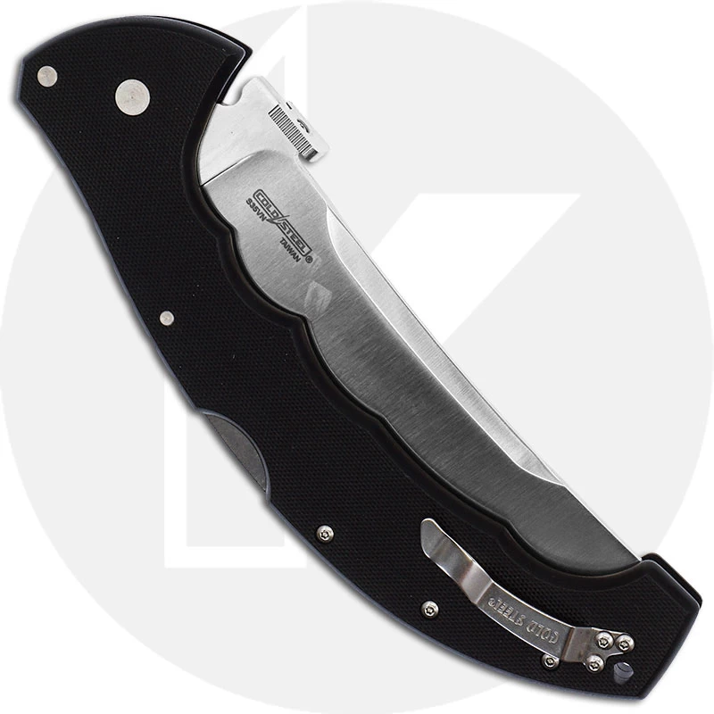 From Cold Steel: “If you have watched me perform cutting demos, you’ll have doubtlessly seen me using a big 5 1/2″ Talwar. Why? Because its blade is extra wide, with a thin V shaped cross section and an upswept point. All these features add up to make it one of the best high-performance folding knives in the world. You won’t see our competitors duplicate the cutting feats of a 5 1/2″ Talwar for one reason, they can’t! Sold with a super strong G-10 handle and an incomparable Tri-AD locking mechanism, our big Talwar is a steal if you want big knife performance from a folder!” – Lynn Thompson