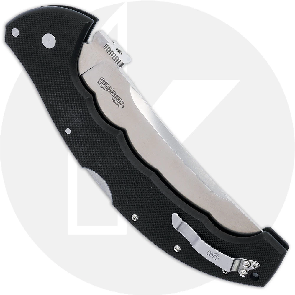 The 21TBXS Cold Steel Talwar Knife features a 5 1/2 inch serrated upswept blade made of S35VN stainless steel, 3.8mm thick, with a satin finish, swedged spine to lessen weight, and a thumb plate for ambidextrous one hand opening (and for Open on Withdrawal option). The slim profile black G10 handle, 7 3/8 inches closed, has texturing and finger grooved contours for comfort and secure grip, sturdy Tri-AD Lock, a lanyard hole, and an ambidextrous steel pocket clip mounted at the butt end. The Talwar Knife has an overall open length of 12 7/8 inches, and it weighs 8.6 ounces. Made in Taiwan.