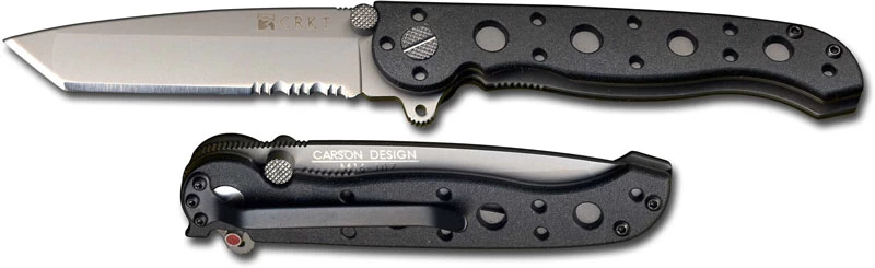 The illustrated CRKT knife is the Zytel CRKT Compact EDC Knife, designed by Kit Carson. This Zytel CRKT Compact EDC knife features a 3″ part serrated tanto blade made of 8Cr15MoV stainless steel, .098″ thick, with a Rockwell hardness of 55-57. The blade of this CRKT knife has a non reflective bead blast finish, a notched thumb rest, dual thumb studs and Carson Flipper for ambidextrous one hand opening. The drilled textured black Zytel handle, 4″ closed, has dual 2Cr13 stainless steel liners, a liner lock and AutoLAWKS knife safety. A removable black stainless steel pocket clip is mounted at the pivot end of this CRKT knife. The Zytel CRKT Compact EDC Knife with part serrated tanto blade has an overall length of 7.125″ when open and weighs 2.3 ounces.