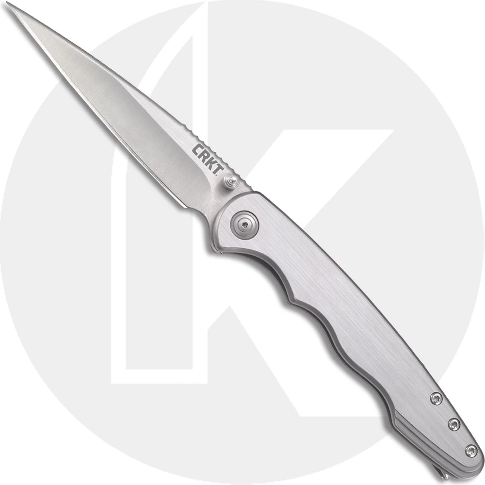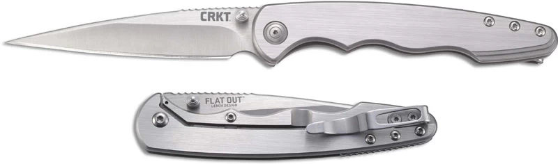 The CRKT 7016 Flat Out Knife, designed by Sussex, Wisconsin knifemaker Matthew Lerch, is a stylish EDC that features a 3.570 inch Wharncliffe blade made of 8Cr13MoV stainless steel, .122 inches thick, with a swedged tip, two tone brushed and satin finish, a notched thumb rest for secure grip, dual thumb studs and OutBurst Assist for lightning fast one hand opening. The slender stainless steel handle, 4.421 inches closed, has slight finger grooves and understated stepped contour, a sturdy frame lock and a deep carry pocket clip. The Flat Out Knife has an overall open length of 8.063 inches, and it weighs 3.6 ounces.