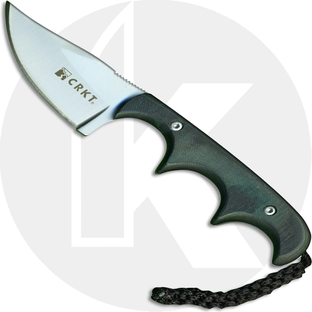 The illustrated CRKT Knife is the CRKT Folts Minimalist Knife, designed by knifemaker Alan Folts. This Folts Minimalist Knife is a small lightweight fixed blade knife that features a 2.125″ bowie fixed blade made of 5Cr15MoV stainless steel, .108″ thick, with a Rockwell hardness of 55-57. The blade of this CRKT knife has a non reflective bead blast finish and a notched thumb rest. The Folts Minimalist has full tang construction; black and green Micarta scales, three finger choil design for secure grip and a braided fob. A custom fitted glass filled nylon sheath with neck para cord is included with this CRKT knife. The CRKT Folts Minimalist Knife with bowie blade has an overall length of 5.13″ and weighs only 2.1 ounces with the sheath.