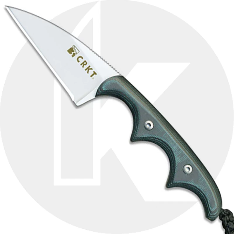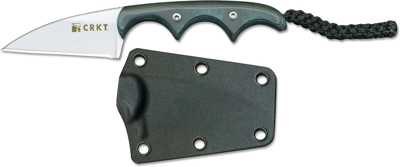 The illustrated CRKT Knife is the CRKT Folts Minimalist Knife, designed by knifemaker Alan Folts. The Folts Minimalist Knife is a small lightweight fixed blade knife that features a 2.0″ Wharncliffe blade made of 5Cr15MoV stainless steel, .10″ thick, with a Rockwell hardness of 55-57. The blade of this CRKT knife has a non reflective bead blast finish and a notched thumb rest. The Folts Minimalist has full tang construction; black and green Micarta scales, three finger choil design for secure grip and a braided fob. A custom fitted glass filled nylon sheath with neck para cord is included with this CRKT knife. The CRKT Folts Minimalist Knife has an overall length of 5.00″ and weighs only 1.6 ounces with the sheath.