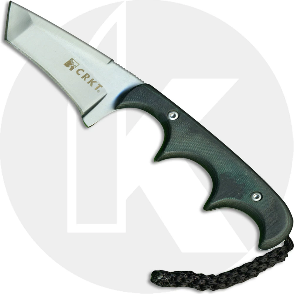 The illustrated CRKT Knife is the CRKT Folts Minimalist Knife, designed by knifemaker Alan Folts. This Folts Minimalist Knife is a small lightweight fixed blade knife that features a 2.125″ tanto fixed blade made of 5Cr15MoV stainless steel, .11″ thick, with a Rockwell hardness of 55-57. The blade of this CRKT knife has a non reflective bead blast finish and a notched thumb rest. The Folts Minimalist has full tang construction; black and green Micarta scales, three finger choil design for secure grip and a braided fob. A custom fitted glass filled nylon sheath with neck para cord is included with this CRKT knife. The CRKT Folts Minimalist Knife with tanto blade has an overall length of 5.13″ and weighs only 2.1 ounces with the sheath.