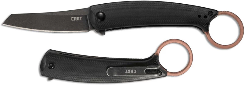 The 7150 CRKT IBI Knife, designed by Jesper Voxnaes of Loegstrup, Denmark, is a sweet little everyday carry that features a 2.71 inch reverse tanto blade made of high performance D2 tool steel, .11 inches thick, with a non reflective black stonewash finish, and a flipper for ambidextrous one hand opening. The slim profile black G10 handle, 4.81 inches closed, has the IKBS Ball Bearing Pivot System for smooth, fast opening, sturdy liner lock, unusual copper pommel ring for secure grip (that will develop a natural patina over time), and a metal pocket clip. The IBI Knife has an overall open length of 7.50 inches, and it weighs 2.80 ounces. Made in China.