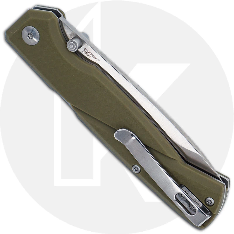 The 6434 CRKT Kova Knife, designed by Ken Steigerwalt of Orangeville, Pennsylvania, is a value priced EDC that features a 3.50 inch drop point blade made of 8Cr13MoV stainless steel, .13 inch thick, with satin finish and dual thumb studs for ambidextrous one hand opening. The slim profile OD green GRN (glass reinforced nylon) handle, 4.52 inches closed, has a subtle pattern for visual interest and secure grip, steel liners for strength, sturdy Front Lock and a removable deep carry pocket clip mounted at the butt end. The CRKT Kova has an overall open length of 8.00 inches, and it weighs 3.70 ounces. Made in China.