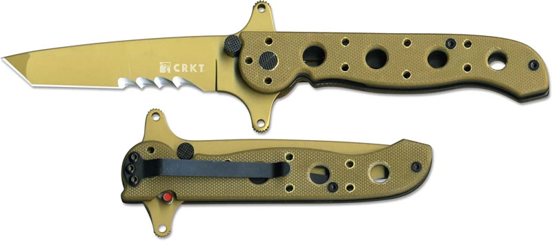 The illustrated CRKT knife is the Slim Profile CRKT M16 Special Forces Desert G10 knife, designed by Kit Carson, that features a 3.50″ part serrated tanto blade made of 8Cr14MoV stainless steel, .12″ thick, with a Rockwell hardness of 58-59. The blade of this CRKT knife has a non reflective Desert Tan titanium nitride coat, dual thumb studs and dual Carson flippers for ambidextrous one hand opening. The drilled Desert Tan G10 handle, 4.75″ closed, has dual black stainless steel liners, a liner lock and AutoLAWKS. A side to side reversible black stainless steel pocket clip is mounted at the pivot end of this CRKT knife. The Slim Profile CRKT M16 Special Forces Desert G10 knife has an overall length of 8.25″ when open, and it weighs 4.0 ounces.