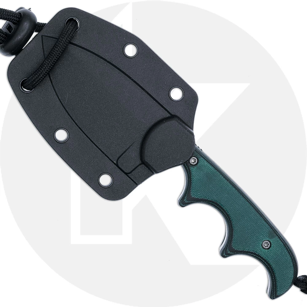 The 2396 CRKT Minimalist Spear Point Neck Knife, designed by Alan Folts of Melbourne, Florida, features a 2.15 inch spear point fixed blade made of 8Cr13MoV stainless steel, .15 inch thick, with a stonewash finish, top swedge and fuller to lessen weight, and a notched thumb rest for secure purchase. The Minimalist Spear Point has full tang construction for strength, finger grooves for secure grip, green and black resin infused fiber scales, and a braided fob. A black thermoplastic sheath with neck lanyard is included. The CRKT Minimalist Spear Point neck knife has an overall length of 5.19 inches, and it weighs 2.10 ounces, 3.20 ounces with the sheath. Made in China.
