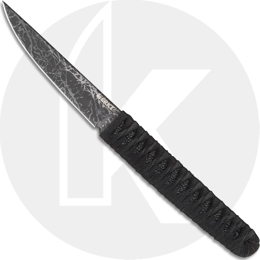 From the CRKT website: The Obake™ by Lucas Burnley is bold. It’s a throwback to a classic Japanese Kwaiken design that’s ready to throw down, if trouble turns up. The distinctive blade of this full tang fixed blade knife has a gray titanium nitride finish that is acid etched to give it a unique pattern that will be exclusive to each fortunate owner. The handle has a katana style nylon cord wrap over a black faux ray skin.