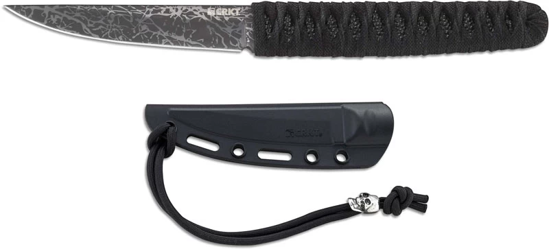 The illustrated CRKT Knife is the CRKT Obake Knife, designed by Lucas Burnley, that features a 3.64″ modified clip point blade made of 8Cr14MoV stainless steel, .130″ thick, with a Rockwell hardness of 58-59. The hollow ground blade of this CRKT knife has a non reflective gray titanium nitride coat with unique acid etch finish. The Obake Knife has full tang construction for strength; faux ray skin handle with black paracord wrapped grip. A glass filled nylon sheath with lanyard and skull bead is included with this CRKT Knife. The Obake Knife has an overall length of 7.63″, and it weighs 2.4 ounces; 3.2 ounces with the sheath.