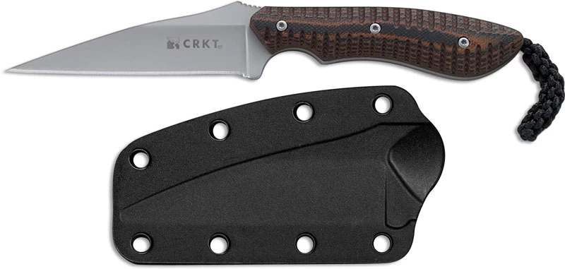 The illustrated CRKT Knife is the CRKT SPEW Knife, designed by knifemaker Alan Folts. The SPEW Knife (Small Pocket Everyday Wharncliffe) is a small lightweight fixed blade knife that features a 3.0″ Wharncliffe blade made of 5Cr15MoV stainless steel, .10″ thick, with a Rockwell hardness of 55-57. The blade of this CRKT knife has a non reflective bead blast finish and a notched thumb ramp for secure grip. The SPEW has full tang construction; grooved gray and orange Micarta scales and a braided fob. A custom fitted Zytel sheath with neck para cord is included with this CRKT knife. The CRKT SPEW Knife has an overall length of 6.25″ and weighs 4.1 ounces with the sheath.
