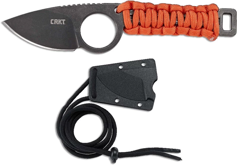 The 2415 CRKT Tailbone Knife, designed by TJ Schwarz of Boise, Idaho, is a compact EDC neck knife with an unusual flexible handle that stays rigid while cutting! The Tailbone features a 2.13 inch drop point fixed blade made of 8Cr13MoV stainless steel, .15 inch thick, with a non reflective black stonewash finish, a notched thumb rest and a finger hole for secure purchase. The Tailbone has the aforementioned flexible handle made of carbon steel machine chain, an orange cord wrap grip and a large lanyard hole. A black thermoplastic sheath with neck lanyard is included. The CRKT Tailbone has an overall length of 6.31 inches, and it weighs 2.0 ounces; 3.0 ounces with the sheath. Made in China.