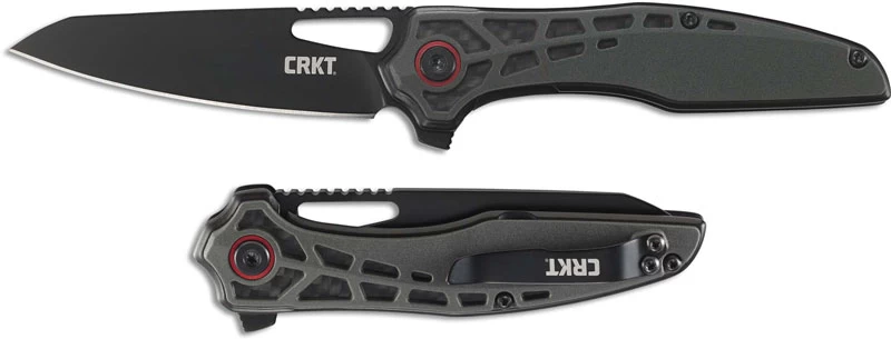 The 6290 CRKT Thero Knife, designed by TJ Schwarz of Boise, Idaho, is a stylish everyday carry that features a 3.08 inch sheepsfoot blade made of 8Cr14MoV stainless steel, .125 inches thick, with a non reflective black oxide finish, a notched thumb rest for secure grip, thumb hole and dual thumb studs for ambidextrous one hand opening. The black GRN (glass reinforced nylon) handle, 4.22 inches closed, has a cutout pattern that reveals a carbon fiber underlayer, and a bright red pivot ring for visual interest, a liner lock, and a removable stainless steel pocket clip mounted at the butt end. The Thero Knife has an overall open length of 7.31 inches, and it weighs 3.1 ounces.
