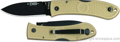 The illustrated KABAR knife is the KABAR Dozier Folding Hunter, designed by Bob Dozier, that features a 3″ drop point blade made of AUS8A stainless steel, with a Rockwell hardness of 56-58. The black coated blade of this KABAR knife has a high hollow grind, the Dozier Design logo, a notched thumb rest, and a reversible thumb stud for one hand opening. The slim coyote brown Zytel handle, 4 1/4″ closed, has checkering for secure grip, and a lockback. A side to side reversible black metal pocket clip is mounted at the butt end of this KABAR knife. The KABAR Dozier Folding Hunter has an overall open length of 7 1/4″.