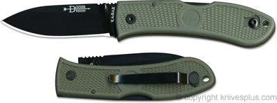 The illustrated KABAR knife is the KABAR Dozier Folding Hunter, designed by Bob Dozier, that features a 3″ drop point blade made of AUS8A stainless steel, with a Rockwell hardness of 56-58. The black coated blade of this KABAR knife has a high hollow grind, the Dozier Design logo, a notched thumb rest, and a reversible thumb stud for one hand opening. The slim foliage green Zytel handle, 4 1/4″ closed, has checkering for secure grip, and a lockback. A side to side reversible black metal pocket clip is mounted at the butt end of this KABAR knife. The KABAR Dozier Folding Hunter has an overall open length of 7 1/4″.