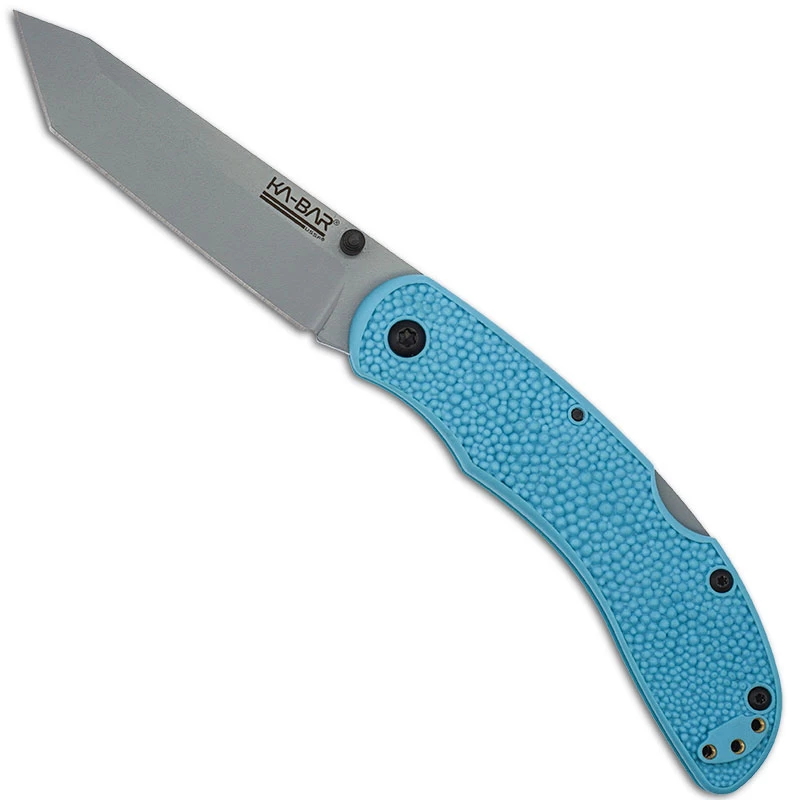 The 5698SF KA-BAR USSF Corser Folder is a value priced EDC that features a 3.5 inch tanto blade made of AUS 8A stainless steel, .114 inches thick, with a Rockwell hardness of 56-58, a flat grind, non reflective gray powder coat and dual thumb studs for ambidextrous one hand opening. The slim, pebbled blue GFN-PA66 handle, 4.375 inches closed, has ergonomic contours for comfort, sturdy lockback and a side to side reversible pocket clip mounted at the butt end. The KA-BAR USSF Corser Folder Knife has an overall open length of 7.875 inches, and it weighs 3.2 ounces. Made in Taiwan.