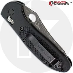 The illustrated MODIFIED Benchmade Knife is the Benchmade Griptilian Knife, designed by Mel Pardue. This MODIFIED Griptilian knife features an ACID STONEWASHED 3.45″ modified sheepfoot blade made of S30V stainless steel, .115″ thick, with a Rockwell hardness of 58-61. The ACID STONEWASHED blade of this Benchmade knife has a hollow grind, a notched thumb rest for secure grip, and a blade hole for ambidextrous one hand opening. The black Noryl GTX and Valox handle, 4.62″ closed, has double stainless steel liners, ambidextrous AXIS lock and a lanyard hole. A side to side reversible steel pocket clip is mounted at the butt end of this Benchmade knife. The Benchmade Griptilian Knife with modified sheepfoot blade has an overall open length of 8.07″, and weighs 3.25 ounces. Made in the USA.