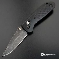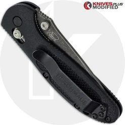 The illustrated MODIFIED Benchmade Knife is the Benchmade Mini Griptilian Knife, designed by Mel Pardue. This Mini Griptilian knife features a 2.91″ ACID STONEWASHED modified drop point blade made of S30V stainless steel, .100″ thick, with a Rockwell hardness of 58-61. The ACID STONEWASHED blade of this Benchmade knife has a hollow grind, a notched thumb rest for secure grip, and dual thumb studs for ambidextrous one hand opening. The BLACK glass filled nylon handle, 3.87″ closed, has double stainless steel liners, ambidextrous AXIS lock and a lanyard hole. A side to side reversible steel pocket clip is mounted at the butt end of this Benchmade knife. The MODIFIED Benchmade Mini Griptilian Knife with ACID STONEWASHED modified drop point blade and BLACK handle has an overall open length of 6.78″, and weighs 2.56 ounces. Made in the USA.