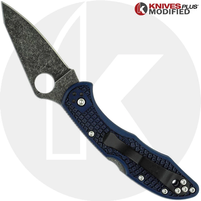 The illustrated Spyderco Knife is the MODIFIED Spyderco Delica 4 Lightweight Knife that features a REGROUND 2.9″ blade made of VG10 stainless steel. The REGROUND blade of this Spyderco knife has a full flat grind WITH acid wash, a notched thumb ramp and an enlarged hole for ambidextrous one hand opening. The NAVY BLUE RIT DYED fiberglass reinforced nylon handle, 4.25″ closed, has Bi-Directional texturing for maximum grip, skeletonized steel liners, a Boye dent lockback, and a lanyard hole. A side to side and end to end reversible black steel pocket clip is included with this Spyderco knife. The MODIFIED Spyderco Delica 4 Lightweight Knife with flat ground blade and NAVY BLUE RIT DYED handle has an overall open length of 7.15″, and it weighs 2.3 ounces. Made in Japan.