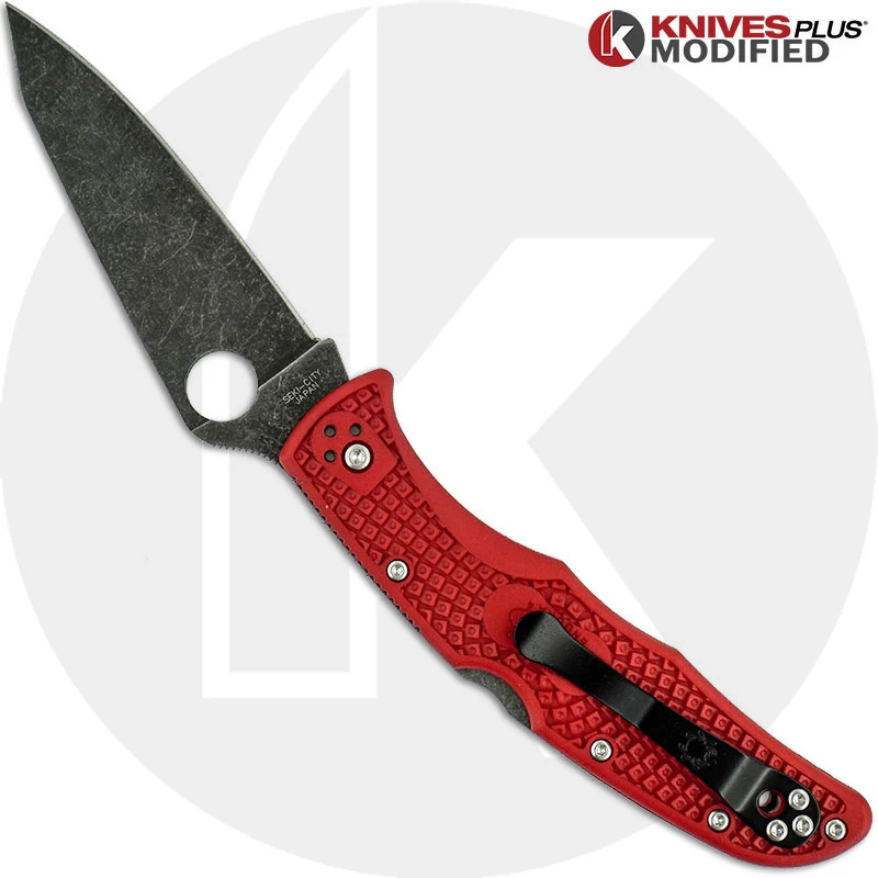The illustrated Spyderco Knife is the MODIFIED Spyderco Endura4 Lightweight Knife that features an ACID STONEWASHED 3.8″ blade made of VG10 stainless steel. The REGROUND blade of this MODIFIED Spyderco knife has a full flat grind WITH AN ACID WASH, a notched thumb ramp and an enlarged hole for ambidextrous one hand opening. The RIT DYED RED fiberglass reinforced nylon handle, 4.98″ closed, has Bi-Directional texturing for maximum grip, skeletonized steel liners, a Boye dent lockback, and a lanyard hole. A side to side and end to end reversible black steel pocket clip is included with this Spyderco knife. The MODIFIED Spyderco Endura4 Lightweight Knife with flat ground blade and RIT DYED RED handle has an overall open length of 8.78″, and it weighs 3.4 ounces. Made in Japan.