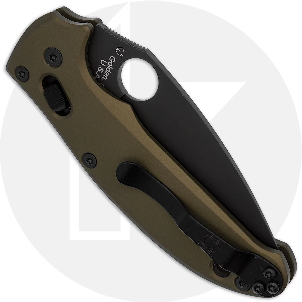 The MODIFIED Spyderco Manix2 Knife features a 3.37″ drop point blade made of CPMS30V stainless steel. The blade of this Spyderco knife has a non reflective black DLC finish, notched thumb ramp and choil for secure grip, and the Spyderco hole for ambidextrous one hand opening. The textured black G10 handles have been replaced with the AWT Linerless Agent Manix FDE Scales, which has a significantly reduced overall weight, bringing the weight from 5 oz to 3.4 oz. The Manix has a closed length of 4.66 inches and a lighter spring and ceramic bearing have been installed. A side to side reversible metal pocket clip is mounted at the butt end of this Spyderco Knife. The Spyderco Manix2 Knife with black blade has an overall length of 8.03″. Made in the USA.