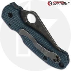 This MODIFIED Spyderco Para 3 Knife features a 3″ modified clip point blade made of CPM S45VN premium stainless steel with an ACID WASH finish, a notched choil and thumb ramp for secure grip, and the Spyderco hole for ambidextrous one hand opening. The contoured, textured black G10 handle has been replaced with the KP Custom Blue Linen Micarta Scales. The Para 3 has a closed length of 4.27″ and comes with a nested Compression Lock, a lined lanyard hole, and a side to side reversible tip-up steel pocket clip. All hardware has been replaced with the KP Blacked Out Hardware Set, and original hardware is included in box. The Spyderco Para 3 Knife has an overall open length of 7.27″, and it weighs 3 ounces. Made in the USA.