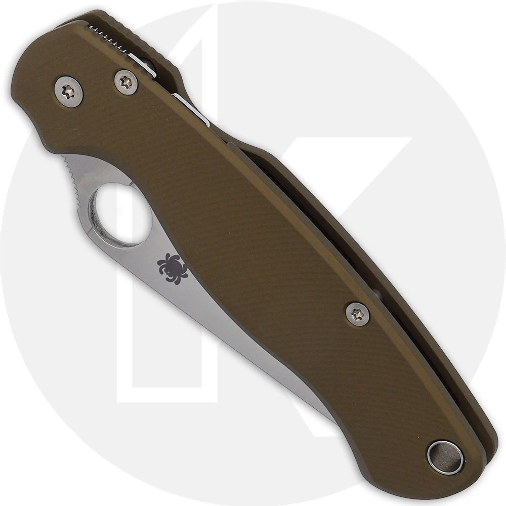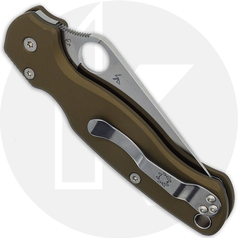The illustrated Spyderco Knife is the MODIFIED Spyderco Para Military2 Knife that features a Satin 3.42″ clip point blade made of CPMS45VN stainless steel. The blade of this Spyderco Knife has a notched choil and thumb ramp for secure grip, and the Spyderco hole for ambidextrous one hand opening. The handles have been replaced with the AWT Agent Para Military 2 FDE Scales, 4.82″ closed, comes with a nested Compression Lock, and a lined lanyard hole. A side to side and end to end reversible steel pocket clip is included with this Spyderco Knife. The MODIFIED Spyderco Para Military2 Knife has an overall length of 8.24″ when open, and it weighs 3.5 ounces. Made in the USA.
