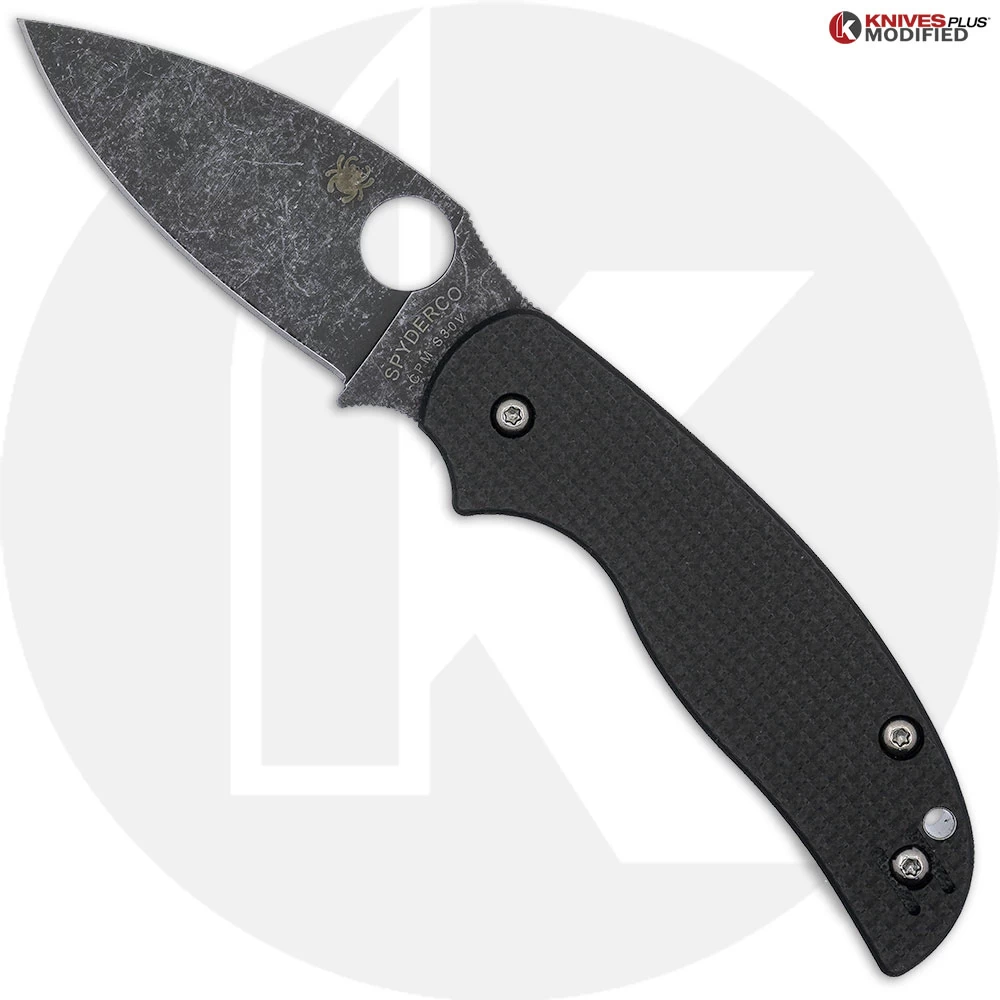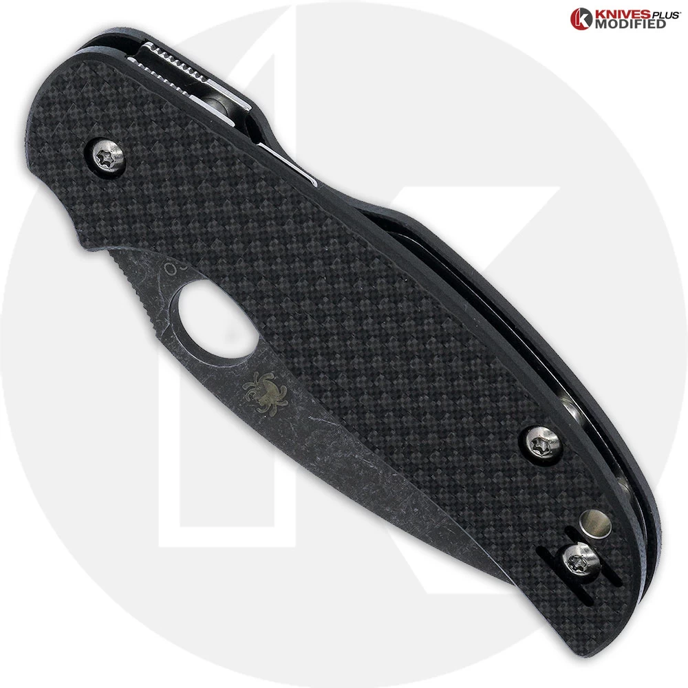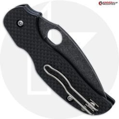 The MODIFIED C123CFPCL Spyderco Sage 5 Knife features an ACID STONEWASHED 3.00 inch leaf blade made of CPM S30V stainless steel, .118 inch thick, with a full flat grind, a notched choil and thumb ramp for secure grip, and the Spyderco hole for ambidextrous one hand opening. The black carbon fiber / G10 laminate handle, 4.17″ closed, has nested stainless steel liners, patented Compression Lock and a lined lanyard hole. The MODIFIED Spyderco Sage 5 Knife has an overall open length of 7.13 inches and it weighs 2.7 ounces. Made in Taiwan.