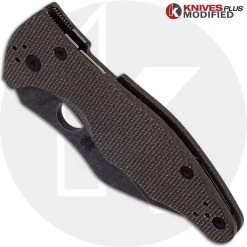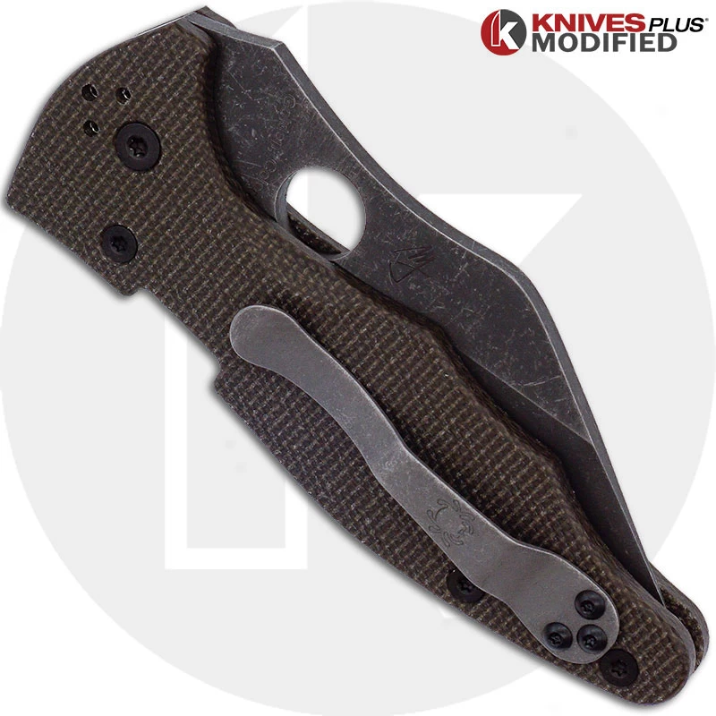 The illustrated MODIFED Spyderco Knife is the Spyderco Yojimbo2 Knife, designed by personal defense trainer Michael Janich, that features an ACID STONEWASHED 3.11″ Wharncliffe blade made of CPMS30V stainless steel. The ACID STONEWASHED blade of this Spyderco knife has a hollow grind and the Spyderco hole for ambidextrous one hand opening. The contoured black G10 handle has been replaced with our KP Custom Brown Micarta Scales. The Yojimbo 2 has a closed length of 4.5″, nested stainless steel liners for strength, and a Compression Lock. All hardware has been replaced with the KP Blacked Out Hardware Set, and original hardware is included in box. A side to side and end to end reversible pocket clip is included with this Spyderco Knife. The MODIFIED Spyderco Yojimbo2 Knife has an overall length of 7.56″ and it weighs 3.8 ounces. Made in the USA.