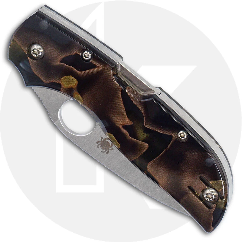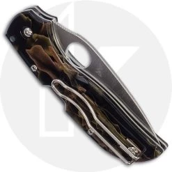 The illustrated Spyderco Knife is the Spyderco Chaparral Knife, that features a 2.80″ blade made of CTS XHP stainless steel, .079″ thick. The blade of this Spyderco knife has a flat grind, a notched choil and thumb rest for secure grip, and the Spyderco hole for ambidextrous one hand opening. The Raffir Noble handle (smoke colored acrylic with brass and copper wire mesh), 3.60″ closed, has a lockback. A side to side reversible wire clip is mounted at the butt end of this Spyderco Knife. The Spyderco Chaparral Knife with Raffir Noble handle has an overall open length of 6.40″, and it weighs 2.3 ounces. Made in Taiwan.