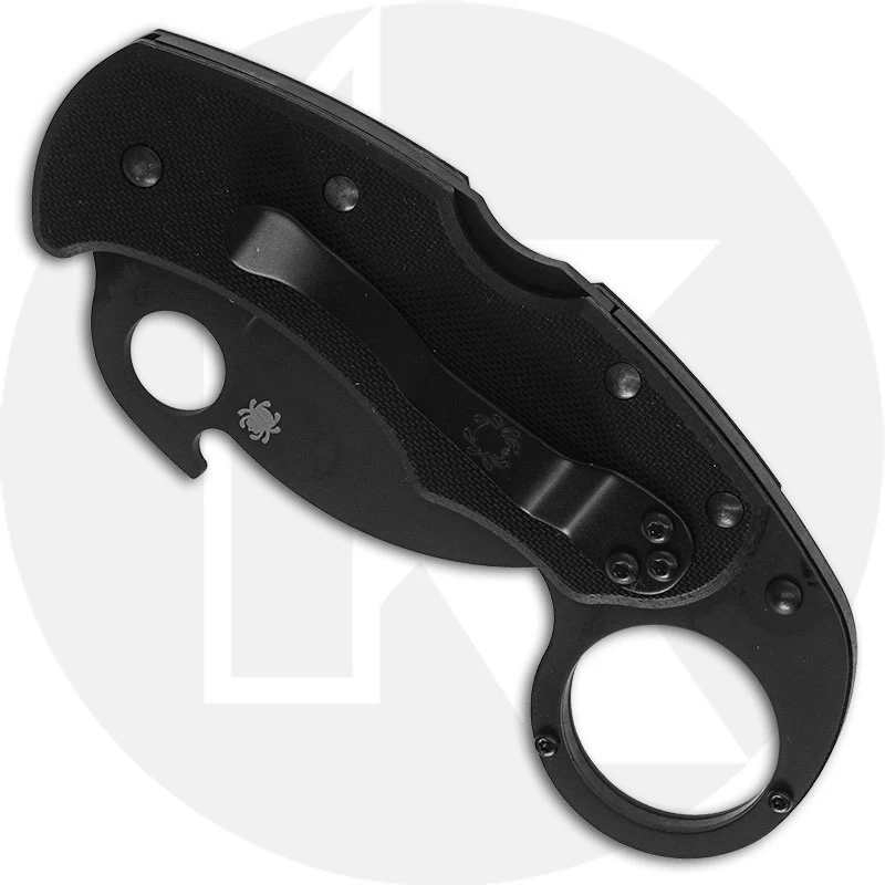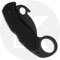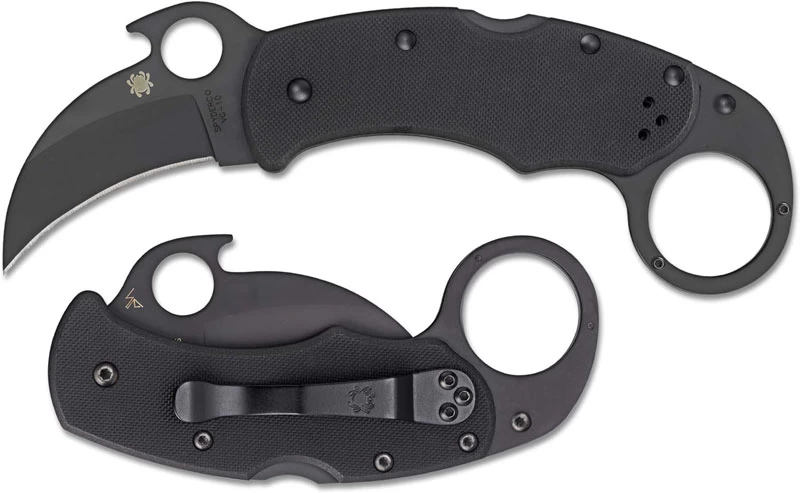 From the Spyderco website: The new all-black Karahawk is a modern folding version of the traditional Southeast Asian Karambit. Its hawkbill blade is VG-10 stainless steel and features a non-reflective titanium carbonitride (TiCN) coating. It includes both a Trademark Round Hole and an Emerson Opening Feature for swift, blade function and is paired with a high strength back lock mechanism. The Karahawk’s handle is constructed with textured G-10 scales and full skeletonized stainless steel liners that are also TiCN coated. The signature ring is reinforced with a G-10 insert and allows traditional Karambit manipulation techniques. A reversible hourglass clip provides ambidextrous tip-up carry and, like all the knife’s other hardware, features a matching low-profile black coating.