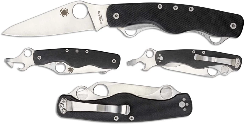 The Spyderco ClipiTool Standard is a compact multi function folder that features a 3.50″ liner locking 8Cr13MoV stainless steel leaf shaped blade, a non locking can opener / small screwdriver tool, and a non locking bottle opener / wire stripper / large screwdriver tool with Spyderco holes for one hand opening. The textured black G10 handle, 4.40″ closed, has nested stainless steel liners and an end to end reversible stainless steel pocket clip. The ClipiTool Standard has an overall open length (with the blade open) of 7.90″, and it weighs 4.2 ounces. Made in China.