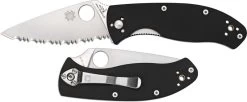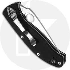 The illustrated Spyderco Knife is the Spyderco Tenacious Knife that features a 3.39″ serrated drop point blade made of 8Cr13Mov stainless steel. The blade of this Spyderco knife has an enlarged Spyderco hole for ambidextrous one hand opening, and a notched thumb ramp. The contoured black G10 handle, 4.38″ closed, has full skeletonized steel liners, jimped Walker Linerlock and a lined lanyard hole. A side to side and end to end reversible metal pocket clip is included with this Spyderco knife. The Spyderco Tenacious Knife with serrated blade has an overall length of 7.77″ and weighs 4 ounces.