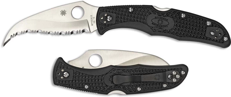 From the Spyderco website regarding the blade shape: What makes the design unique is its reverse “S” shaped blade that is highly effective when cutting, using just the tip, or when using a full arm motion. The curvature of the blade sweeps into fine tip that passes easily through material much like a cat’s claw but with the added ferocity of serrations.