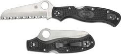 The illustrated Spyderco Knife is the Spyderco Rescue3 Lightweight Knife that features a 3.57″ serrated sheepfoot blade made of VG10 stainless steel, .118″ thick. The blade of this Spyderco knife has a notched thumb ramp for secure grip and a large Spyderco hole for ambidextrous one hand opening. The black FRN (fiberglass reinforced nylon) handle, 4.70″ closed, has Bi-Directional Texturingâ„¢ for secure purchase, a Boye Dent lockback and a lanyard hole. A side to side and end to end reversible stainless steel pocket clip is included with this Spyderco Knife. The Spyderco Rescue3 Lightweight Knife has an overall open length of 8.27″ and it weighs 3.8 ounces. Made in Japan.