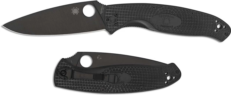 From the 2021 Spyderco Reveal 8 product guide: The large size and extreme cutting performance of the Resilience make it a popular choice among military personnel and other tactical end users. Since many of them operate in environments where light discipline is a concern, we created an all-black version of the Resilience Lightweight. Its high-traction black FRN scales are complemented by a black oxide-coated 8Cr13MoV blade and black coated liners, clip, and handle hardware. This powerhouse cutting tool is available in a choice of PlainEdgeâ„¢, CombinationEdgeâ„¢, or SpyderEdgeâ„¢.